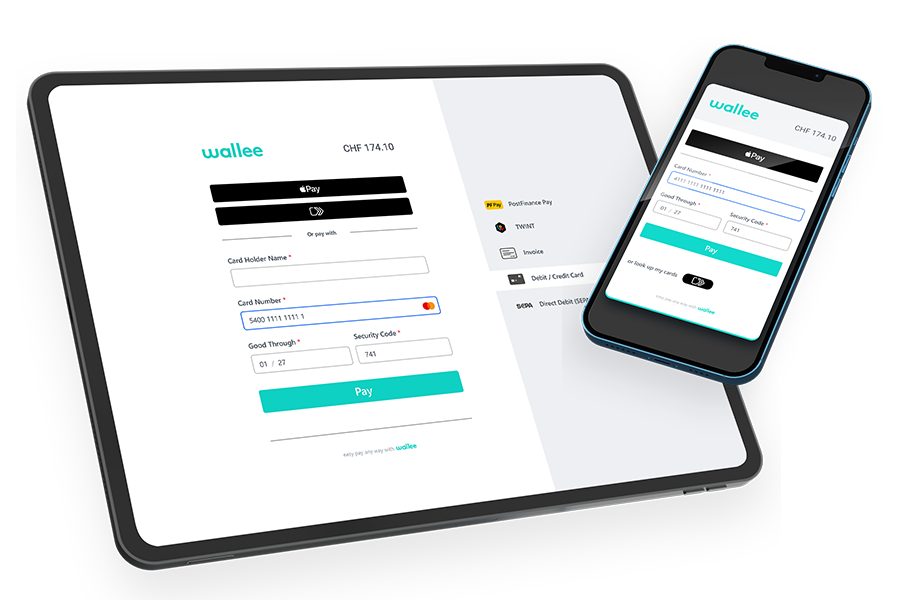 Nutzen Sie über wallee viele lokale und globale Zahlungsmethoden für Ihren Webshop, ERP, Buchungstool oder vor Ort. Die Konfiguration findet bequem über das wallee Portal statt und ist sofort auf allen Kanälen und in Ihrem Check-Out live. Natürlich inkl. aller neuen Technologien, wie Apple Pay, Click to Pay oder TWINT. Ihre Kunden werden es lieben.