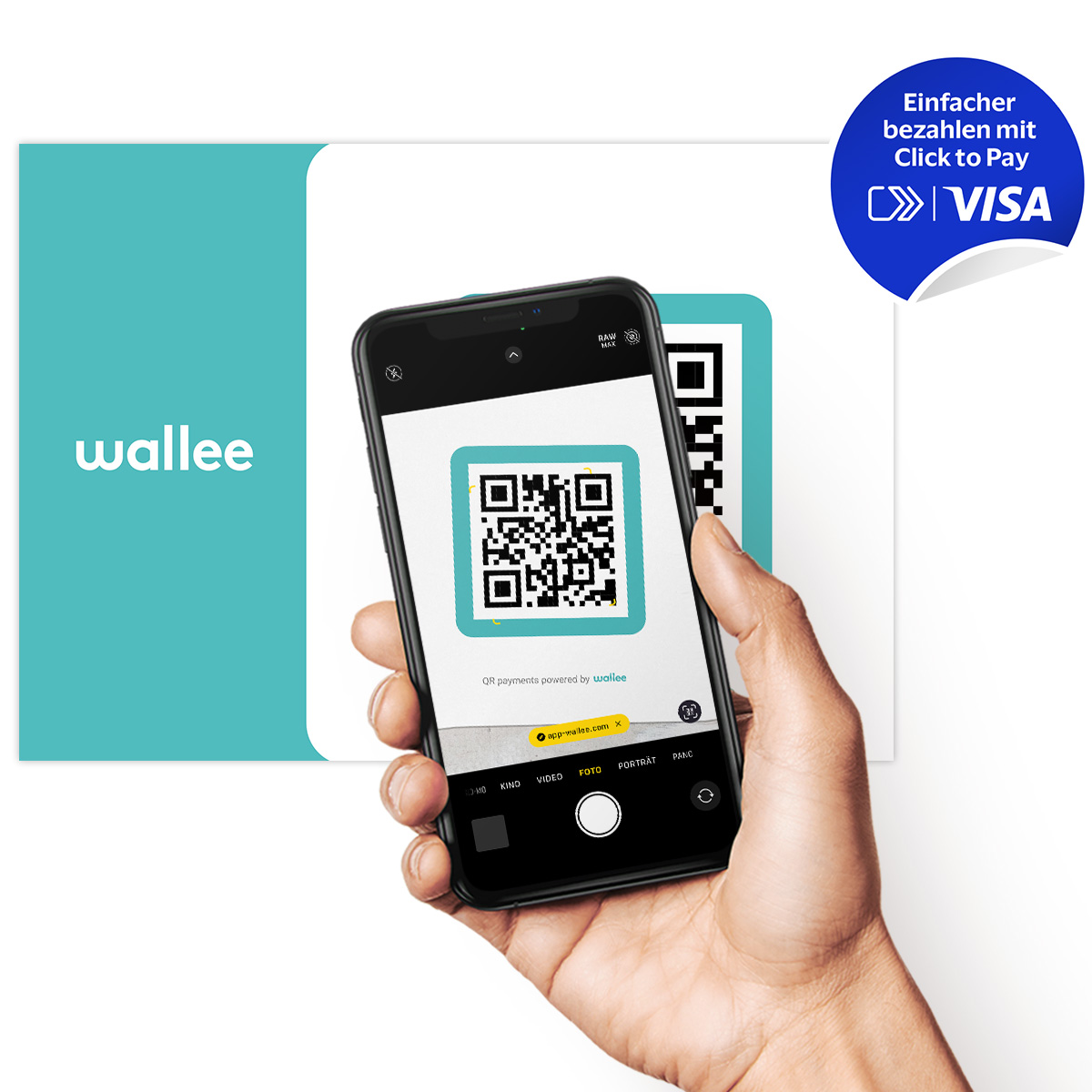 In Verbindung mit Click to Pay sind QR Payments von wallee der vielleicht schnellste Check-Out, den Du deinen Kunden anbieten kannst. Haben sich Kunden einmal bei Click to Pay registriert und ihre Kredit- oder Debitkarten hinterlegt, erkennt dein Check-Out diese automatisch und bietet sie direkt an. Kunden scannen deinen QR Paymentcode, wählen die hinterlegte Karte und zahlen - wortwörtlich mit einem Klick.